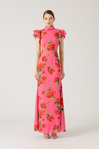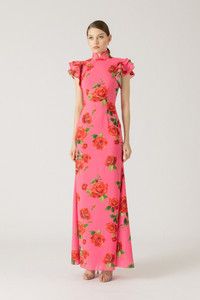 Sylvie is a statement maxi in a SAU LEE original rose print on stretch fabric. Featuring our signature Mandarin collar with contrast piping and decorative frog buttons at the shoulder, layered ruffle sleeves, and a full-length trumpet skirt. SIZE & FIT • Model is wearing size 2 • Model's measurements: height 5'10" bust 32" waist 23.5" hips 34.5" • Length (collar to hem): size 0 - 64.6", size 2 to 6 - 66.6", size 8 - 67.0", size 10 - 67.4" • Fits true to size, take your normal size • Cut for slim fit • Partially lined • Stretch fabric • Mandarin collar • Full-length dress • Bump friendly - fits up to 6 months along MATERIAL & CARE • Shell - 96% Polyester, 4% Spandex • Lining - 97% Polyester, 3% Spandex • Garment Care: Hand wash separately or dry clean