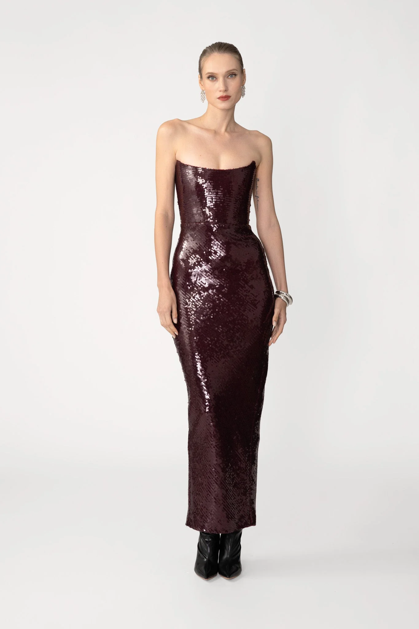 The Venus Dress is a strapless pencil silhouette featuring densely sewn sequins over a corset bodice and a fitted, full-length skirt with a slight stretch to accentuate a classic hourglass shape and shine all evening. MATERIAL & CARE • Shell - 100% Polyester • Lining - 97% Polyester, 3% Spandex • Garment Care: Hand wash separately or dry clean