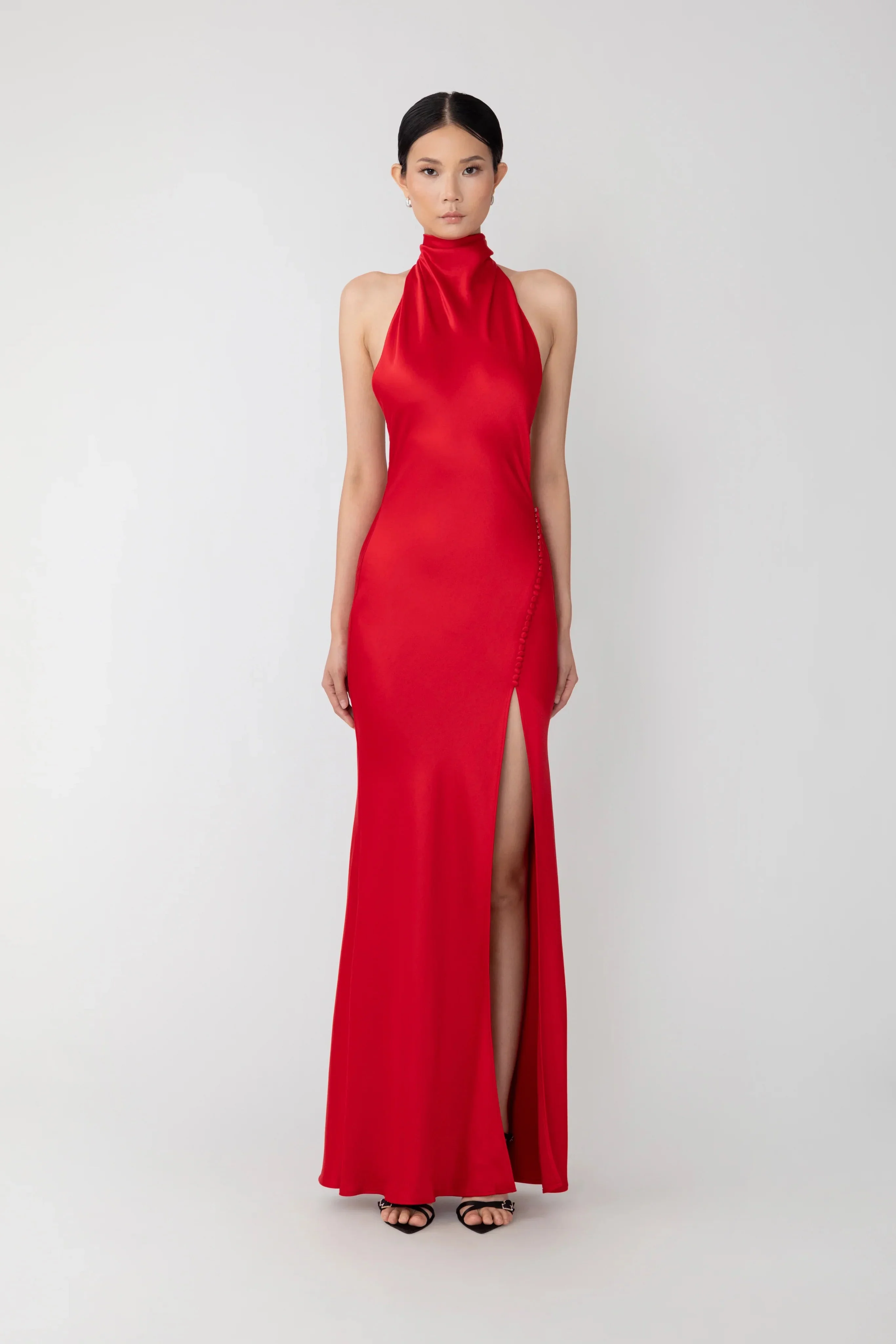 Penelope is our top bestseller that is guaranteed to make you feel effortlessly beautiful and captivating. A stunning bias-cut satin gown featuring a high neck, a low-cut back and open sides, a thigh-high side slit with covered button detail at the hip, and a large statement wings at the back of the neck. SIZE & FIT • Fits true to size, take your normal size • Designed for a slim fit • Unlined • Non-stretch fabric • Halter neck with buttons at the back of the neck • Bump friendly - select one size up from your usual size MATERIAL & CARE • Shell - 53% Viscose, 47% Rayon • Garment Care: Hand wash separately or dry clean
