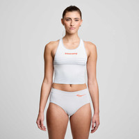 Weightless performance designed for how your body moves. FEATURES & BENEFITS - Our lightest material - Chafe-free bonded fabric - Body mapped perforations - Self-sustained race day storage - High performance pre- and post race warmups - Best for: Race day - Fitted - Primary Material: 240 g/m2 76% Polyester/ 24% Elastane - Polyester/elastane interlock in front has an incredible feel for zero distractions - Polyester/elastane mesh at back panel allows for greater breathability - 40+ UPF protection - Unique yarn structure allows lighter colors to retain a high level of opacity when wet - Bonded side seam rolls to back and bonded hem eliminate potential chafe points - Saucony branding - Model is wearing a size small