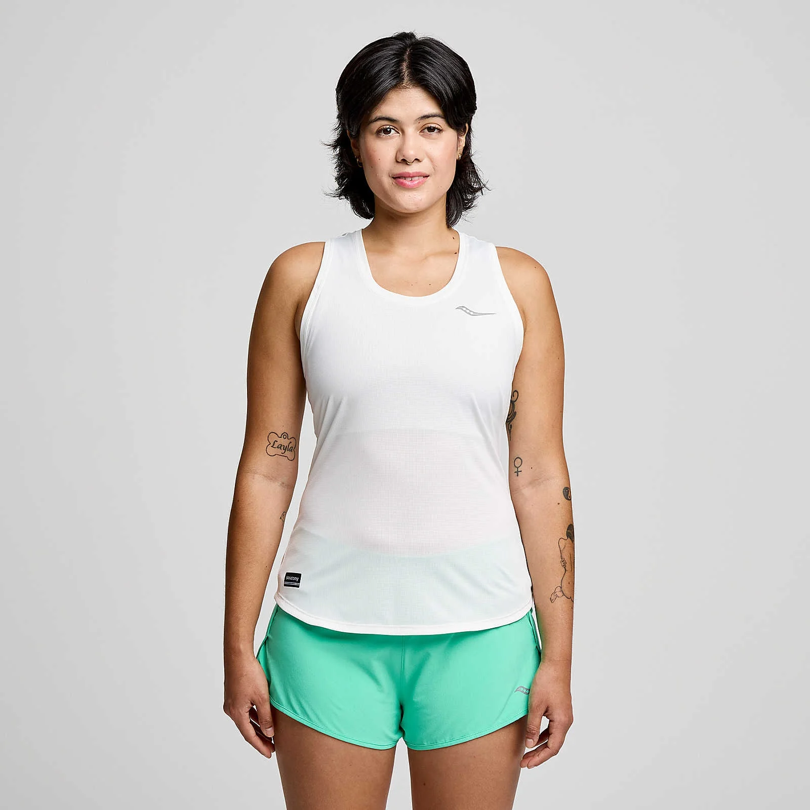 Redesigned for incredible breathability and optimal stretch. FEATURES & BENEFITS - Dialed in fit and function - Best-in-class sweat-wicking - Now with superior 4-way stretch material - Flat lock seams - Made of 92% Recycled Polyester - Best for: Daily runs or workouts - Active fit - Primary material: 140 g/m2 92% Polyester (Recycled) / 8% Elastane - Racerback - Shaped hem is ideal for layering whether tucked or untucked - Small interval locker loop for hanging to dry - Reflective logos and Saucony patch logo - Model is wearing a size small