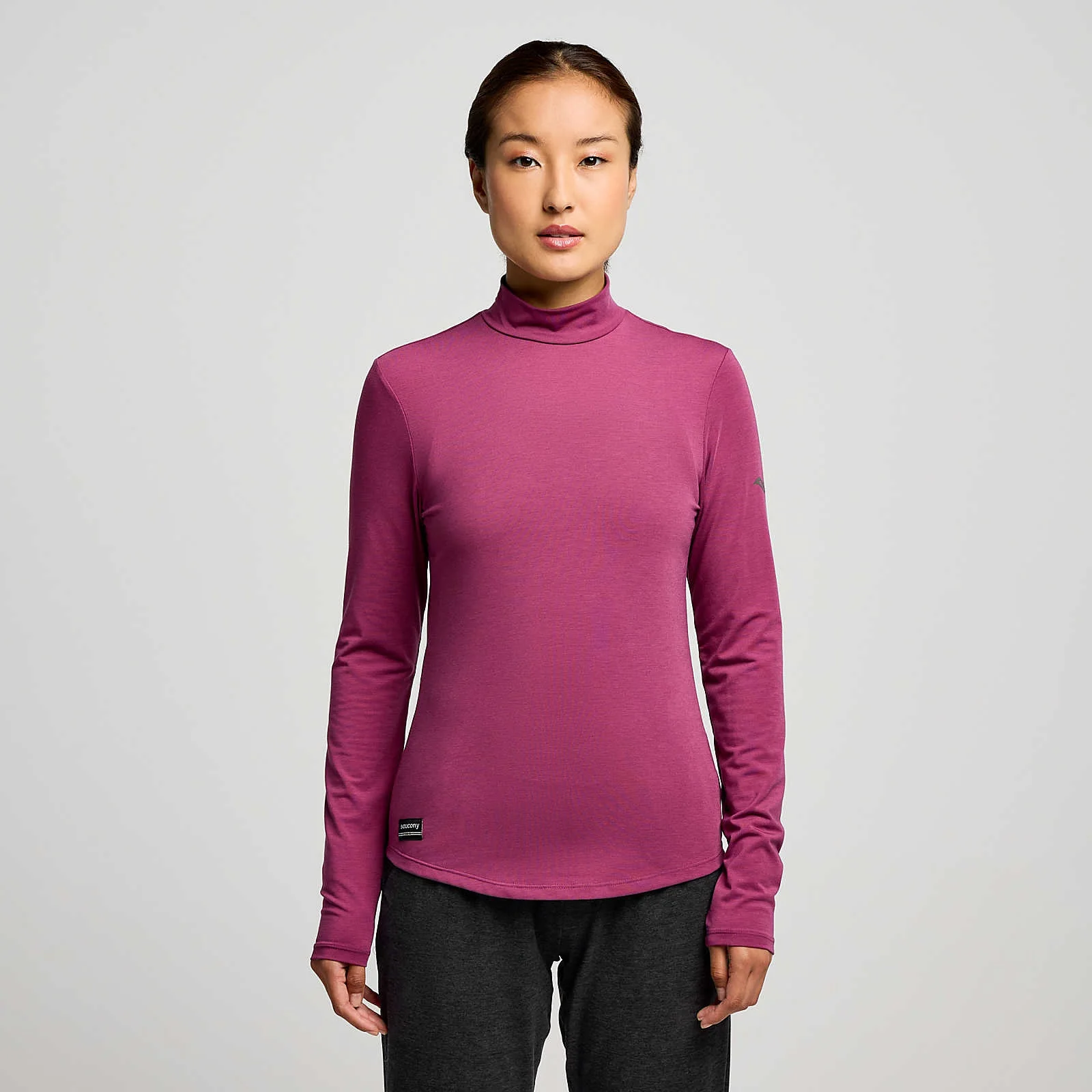 Luxurious comfort that stretches the meaning of active wear. FEATURES & BENEFITS - drirelease® E.C.O dries up to 4x faster than cotton - Buttery-soft hand feel - Responsibly made - Luxurious stretch knit - 30+ UPF rating - Best for: Active, all-day - PRIMARY MATERIAL: 185 g/m2 82% Polyester (Recycled Drirelease®) / 11% Lyocell / 7% Elastane - Mock neck allows for warmth - Reflective logos and Saucony patch log - Model is wearing a size small