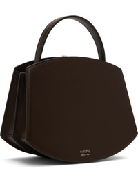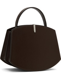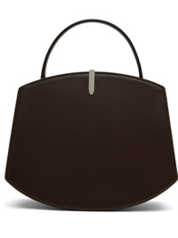 Buffed calfskin top handle bag in brown. · Burnished edges throughout · Fixed carry handle · Silver-tone hardware at face · Accordion panel at sides · Logo stamp at back face · Magnetic tab closure · Card slot at two-compartment interior · Buffed calfskin lining · H6.75" x W8.25 x D4" · Total height: H9.5" Supplier color: Coffee Calfskin. Made in Italy 251163F046015