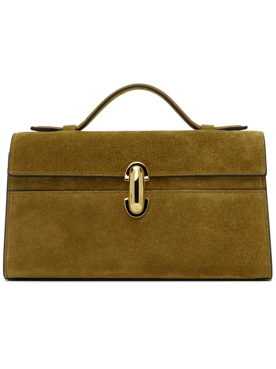 Calfskin suede top handle bag in brown. · Carry handle at top · Turn-lock closure · Card slot at interior · Buffed calfskin lining · Gold-tone hardware · H5.5" x W8.5" x D3" Supplier color: Sepia Calfskin. Made in Italy 252163F046000