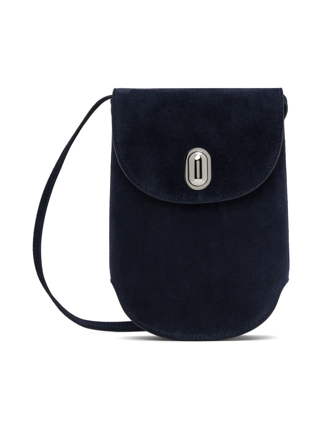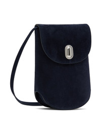 Handcrafted calfskin suede shoulder bag in navy. · Adjustable and detachable crossbody strap · Logo embossed at back face · Hardware at magnetic flap · Card slot at interior · H7.5" x W6" x D2" Supplier color: Navy Calfskin. Made in Italy 242163F048008
