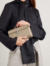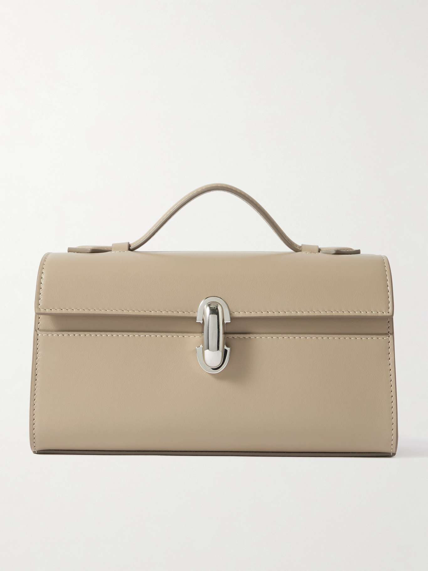 Savette's debut 'Symmetry' collection celebrates "geometry in its purest forms: parallel and perpendicular lines". Part of the sleek range, this 'Pochette' tote has been handmade in Italy from smooth leather and minimally detailed with polished silver-tone hardware. The interior is perfectly sized to fit your phone, keys and cardholder. Lower-Impact Materials. This product is made using at least 50% lower-impact materials or ingredients. Find out more about our NET SUSTAIN criteria here. Details & Care - Off-white leather (Calf) - Top handle - Internal card slot - Unlined - Twist lock-fastening front flap - Designer color: Clay - Comes with a dust bag - Weighs approximately 1.1lbs/ 0.5kg - By purchasing this product, you are supporting responsible leather manufacturing through Leather Working Group.