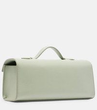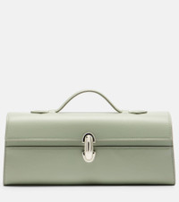 Savette redefines everyday sophistication through meticulously crafted silhouettes and fine materials. Made from leather, the Slim Symmetry tote bag features a structured, elongated silhouette and a signature turn-lock front fastening, accented with silver hardware. Product Details - Material: calf leather - Lining: calf leather - Made in Italy - Designer color name: Mist - Item color: green - Hardware color: silver - Top handle - Internal details: internal slot pocket, single compartment - Closure: turn-lock fastening - Includes: dust bag - Item number: P01071091 Size & Fit - Height 11cm-4.5" - Width 27cm-10.5" - Depth 6,5cm-2.5" - Length of handles 13cm-5"