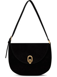 Calfskin suede shoulder bag in black. · Burnished edges throughout · Adjustable shoulder strap · Tab-slot flap · Card slot at interior · Calfskin suede interior · H7.5" x W10" x D0.75" Supplier color: Black Calfskin. Made in Italy 251163F048009