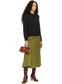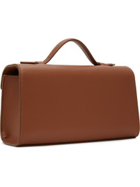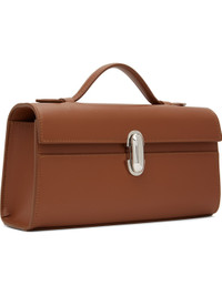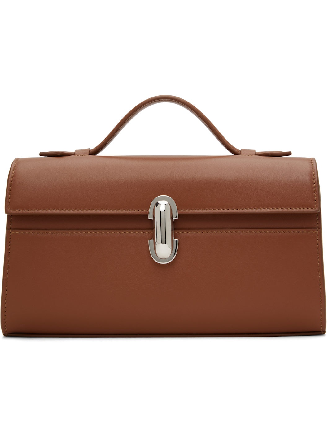 Buffed calfskin top handle bag in tan. · Burnished edges throughout · Fixed carry handle · Turn-lock flap · Card slot at interior · Buffed calfskin lining · H4.75" x W8.5" x D2.75" Supplier color: Maple