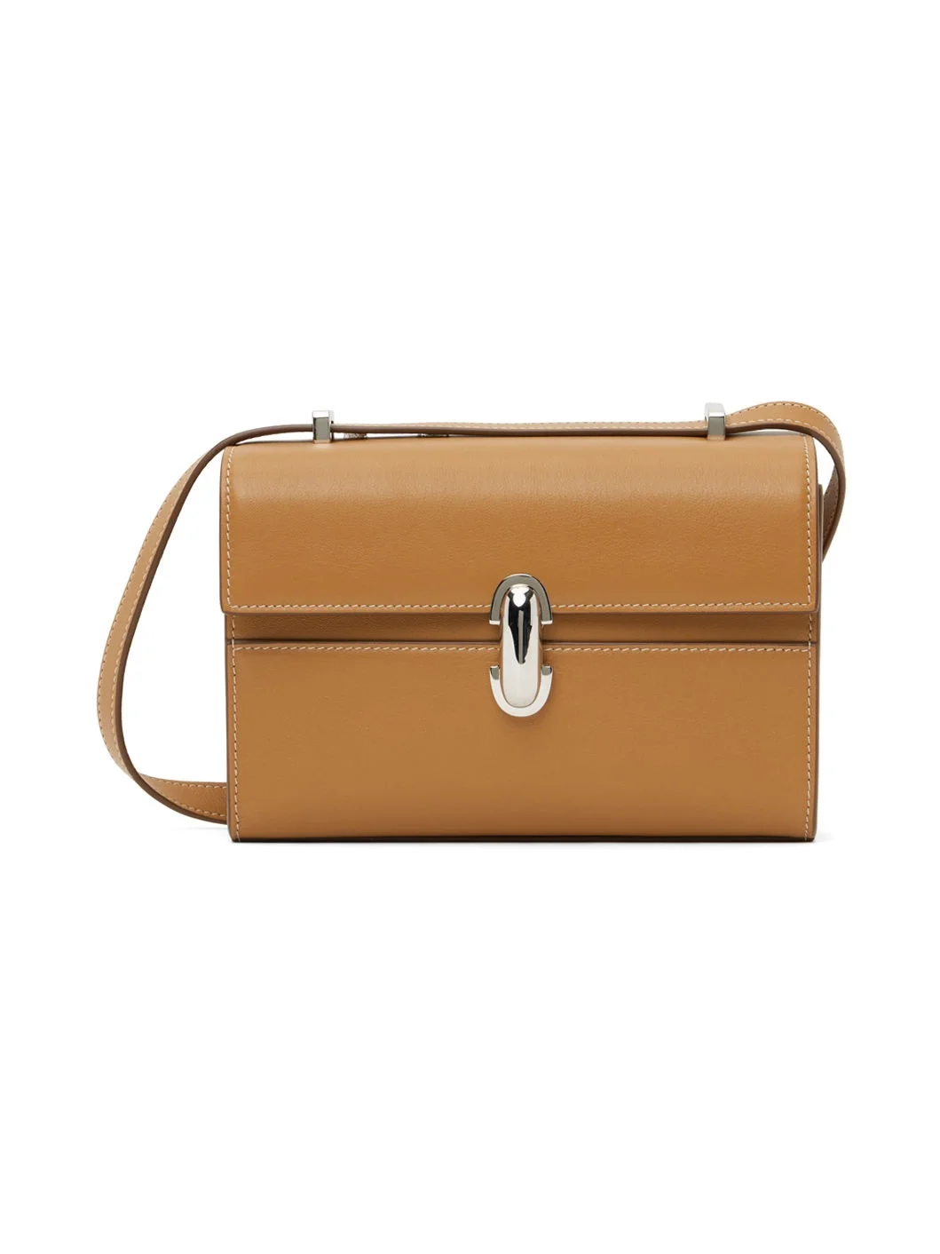 Buffed calfskin shoulder bag in tan. · Convertible crossbody strap · Turn-lock flap · Patch pockets at two-compartment interior · Contrast stitching in off-white · H5.5" x W7.75" x D3.25" Supplier color: Saddle Calfskin. Made in Italy 242163F048016