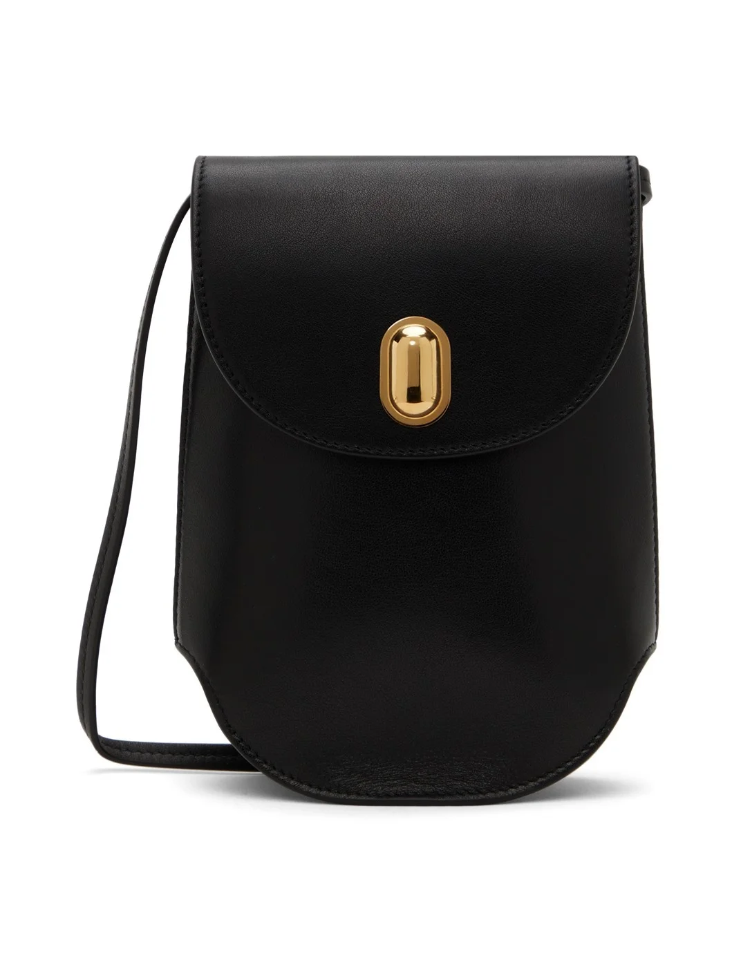 Handcrafted structured buffed calfskin shoulder bag in black. · Adjustable pin-buckle shoulder strap · Logo embossed at back face · Sculptural hardware at foldover flap · Magnetic closure · Suede lining · H7.5 x W6 x D1.5 in Supplier color: Black Calfskin. Made in Italy 241163F048005