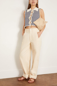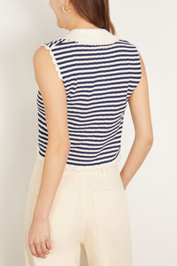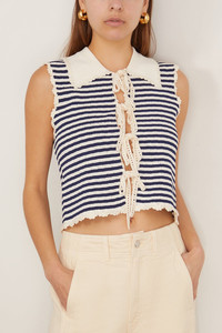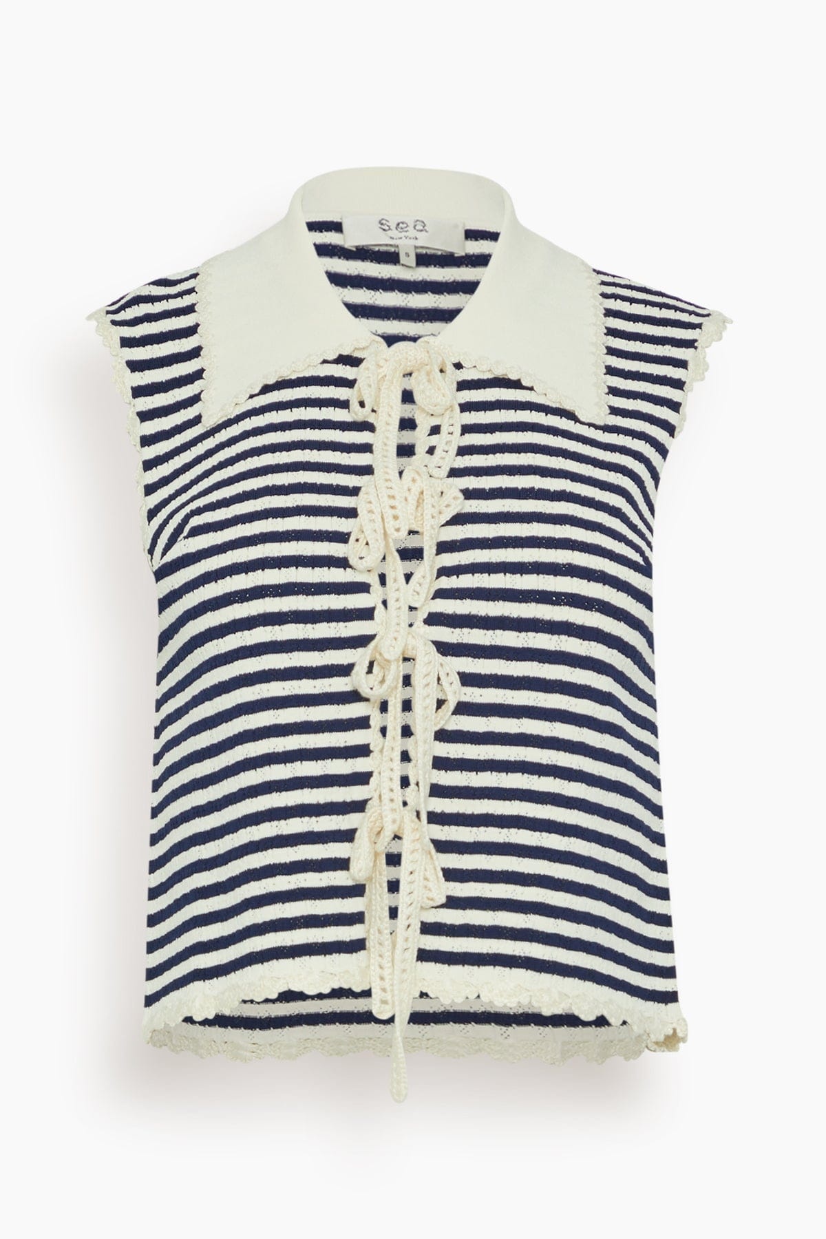 The SEA Addy Striped Knit Vest is a playful piece from their Spring 25 Collection. This vest features a tie front closure and feminine scalloped hemline. Wear yours with jeans and sandals. FIT DESCRIPTION MODEL MEASUREMENTS - Fits true to size, take your normal size - Knit vest - Cropped length - Tie front closure - Scalloped hemline - Spread collar - viscose/ cotton - Emma is wearing a size XS - Bust: 32” - Waist: 25” - Hips: 34” - Height: 5’7”