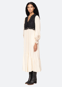 The Adelina battenberg lace combo dress showcases a flattering v-neckline and flowing midi silhouette, framed by long, voluminous sleeves. Intricate battenberg lace accents the bodice and cuffs, adding rich texture and artisanal detail. DETAILS - self-100% viscose - lining-100% cotton - button front - designed for a relaxed fit - style #RS26-070 - model is 5'10'' and wearing a size S