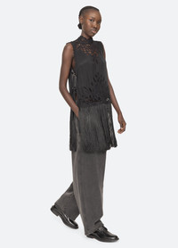 The Adelina lace top features a turtleneck and adjustable D-ring tabs on the sides, adorned with flowing fringe and intricate battenberg lace. Semi-sheer sections of the lace add a romantic quality to this striking, statement-making piece. DETAILS - 100% viscose - button back closure - designed for a relaxed fit - style #RS26-064 - model is 5'10'' and wearing a size S