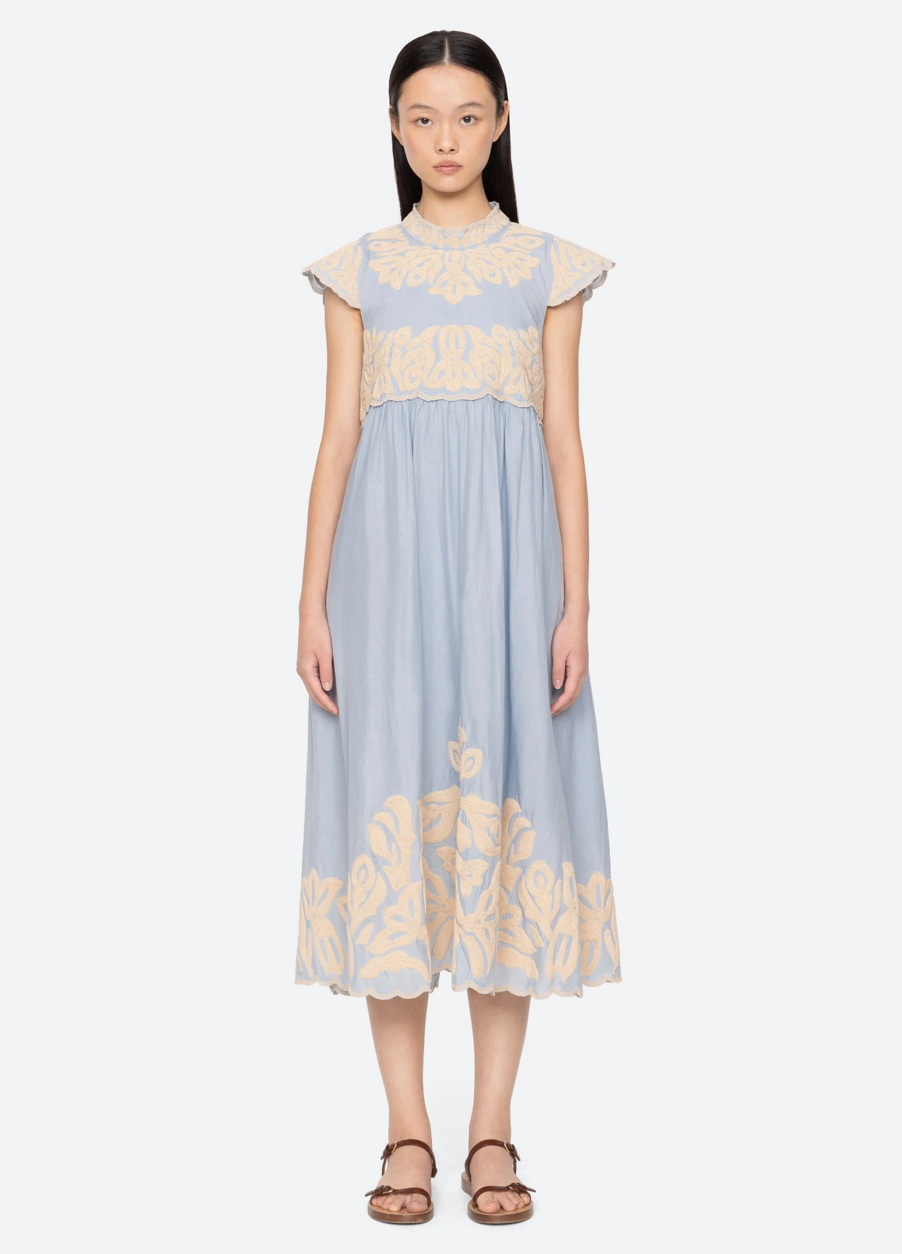 The Alexandra embroidered dress features delicate cap sleeves and a flowing midi silhouette. Intricate abstract embroidery embellishes the dress, adding a contemporary, artful touch to the design. DETAILS - lining-100% cotton - embroidery-50% viscose, 50% polyester - invisible back zipper - designed for a relaxed fit - style #RS26-055 - model is 5'10'' and wearing a size S
