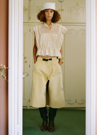 The Andrea workwear culottes feature a cropped wide-leg silhouette in two-tone coloring with a sleek leather belt. Effortlessly combining modern tailoring with subtle details, they reimagine classic workwear for a contemporary wardrobe. DETAILS - 100% cotton - front zipper with hook & bar closure - designed for a relaxed fit - style #SS26-003 - model is 5'10'' and wearing a size 4