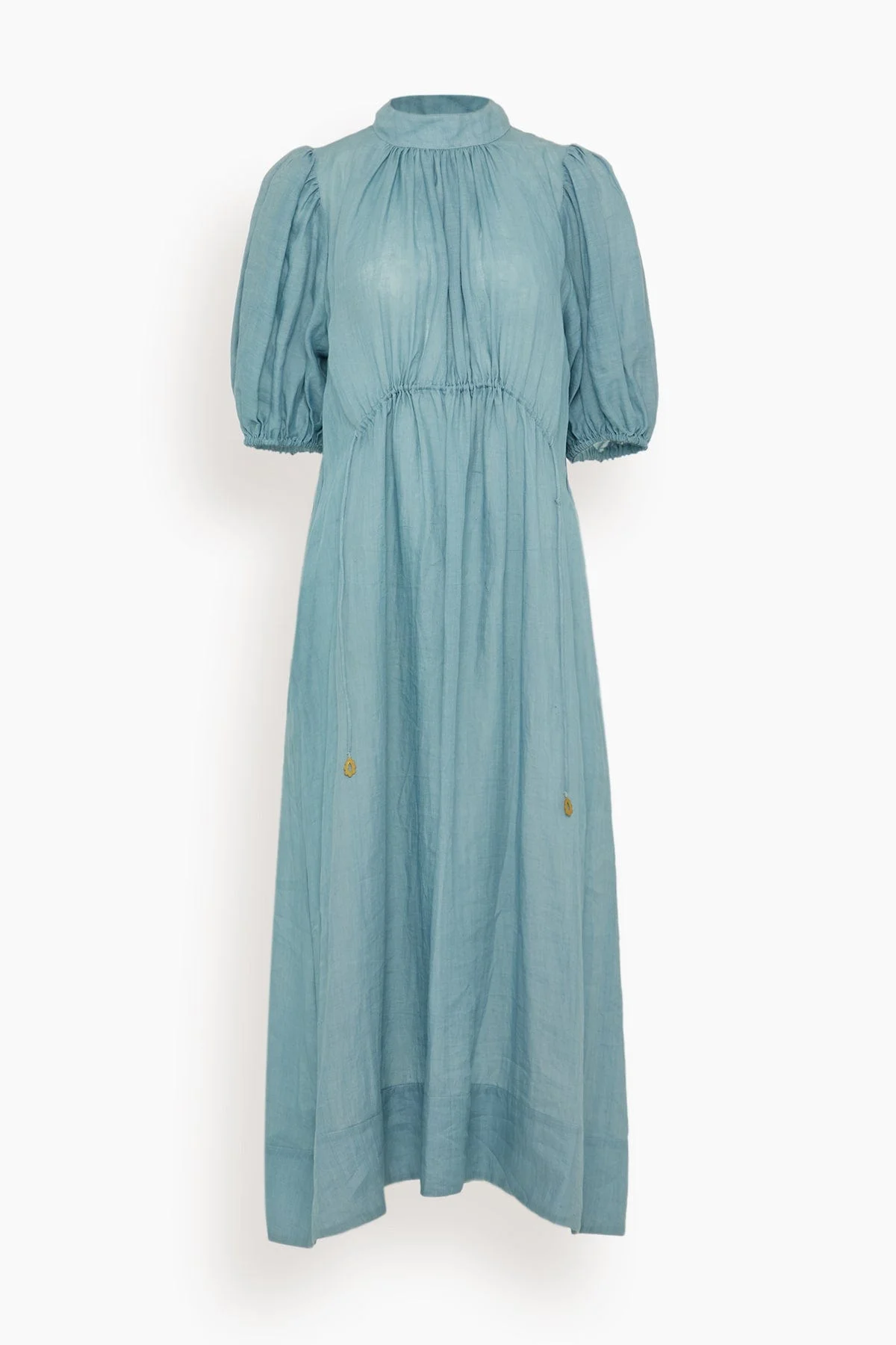 The Sea Anise Solid Puff Sleeve Midi Dress in Blue embodies modern femininity with its soft puff sleeves, graceful midi silhouette, and adjustable waistband with tassel charm accents. - self-100% ramie - lining-100% cotton - button back closure - designed for a relaxed fit