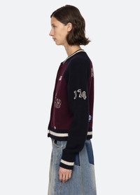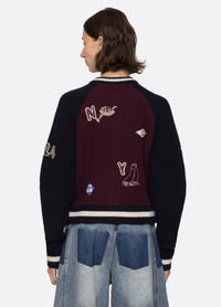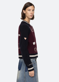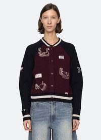 The Archer varsity knit cardigan features detailed embroidery throughout and custom 'Sea' labels. DETAILS - self-100% extra fine merino wool - decoration-100% cotton - button front - designed for a relaxed fit - style #PF25-030 - model is 5'10'' and wearing a size S