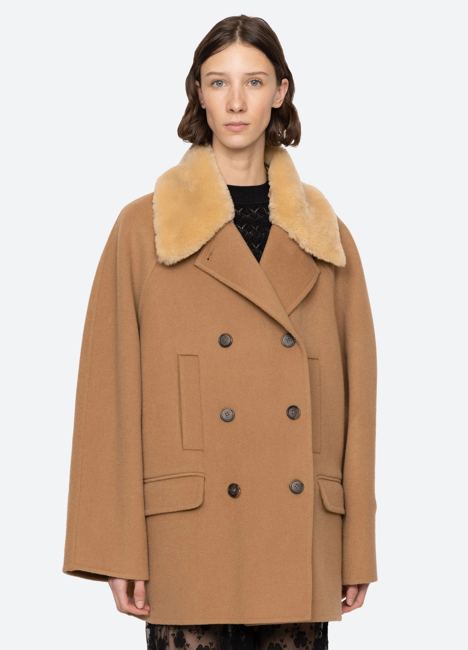 The Astra double faced wool peacoat exudes timeless sophistication with its double-breasted design, plush shearing collar, and streamlined straight-fit silhouette. DETAILS - self-100% wool - collar-50% nylon, 30% resin, 20% leather - lining-55% polyester, 45% viscose - button front - designed for an oversized, relaxed fit - style #AW25-073 - model is 5'10'' and wearing a size S