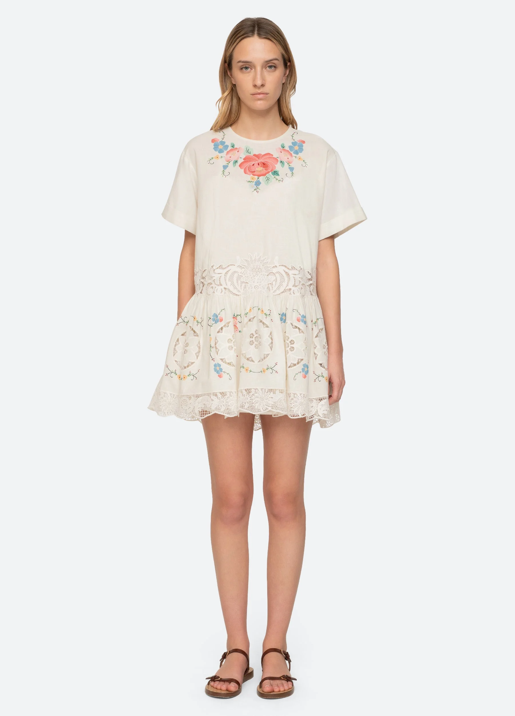 The Astrid embroidered dress features a playful mini silhouette and short sleeves, adorned with bold floral motifs and intricate embroidery throughout for a vibrant, casual appeal. DETAILS - self-85% cotton, 15% linen - lining-100% cotton - embroidery-100% polyester - button back closure - designed for a relaxed fit - style #SS26-057 - model is 5'10'' and wearing a size S