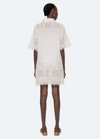 The Babette eyelet coverup is crafted in a breezy mini silhouette, featuring all-over eyelet detailing, scalloped edges, short sleeves, and front tie closures. Its relaxed fit and playful design make it the perfect effortless layer for resort wear. DETAILS - self-100% cotton - embroidery-100% polyester - front tie closure - designed for a relaxed fit - style #RS26-707 - model is 5'10'' and wearing a size S