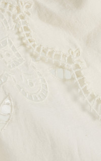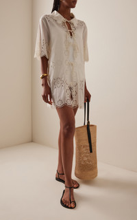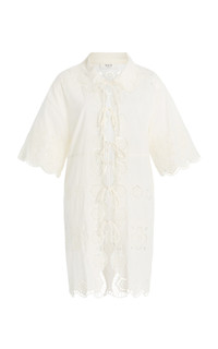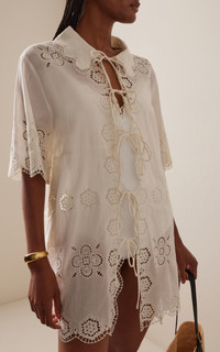 NYC-based Monica Paolini and Sean Monahan dream up pieces that resemble the perfect vintage find—and this season, they lean into their signature cool folksy-femininity. Crafted from 100% cotton, the ‘Babette’ coverup is detailed with floral eyelet embroidery, a scalloped hem, and tie-front closures for a feminine finish. Style it over the matching one-piece for an effortless poolside look. PRODUCT DETAILS - Resort '26 - Slip on - Composition: 100% cotton - Dry clean - Imported SIZE & FIT - Our model is wearing a size Small - Model is 5'10" with a 30" bust, 24" waist, and 34" hip