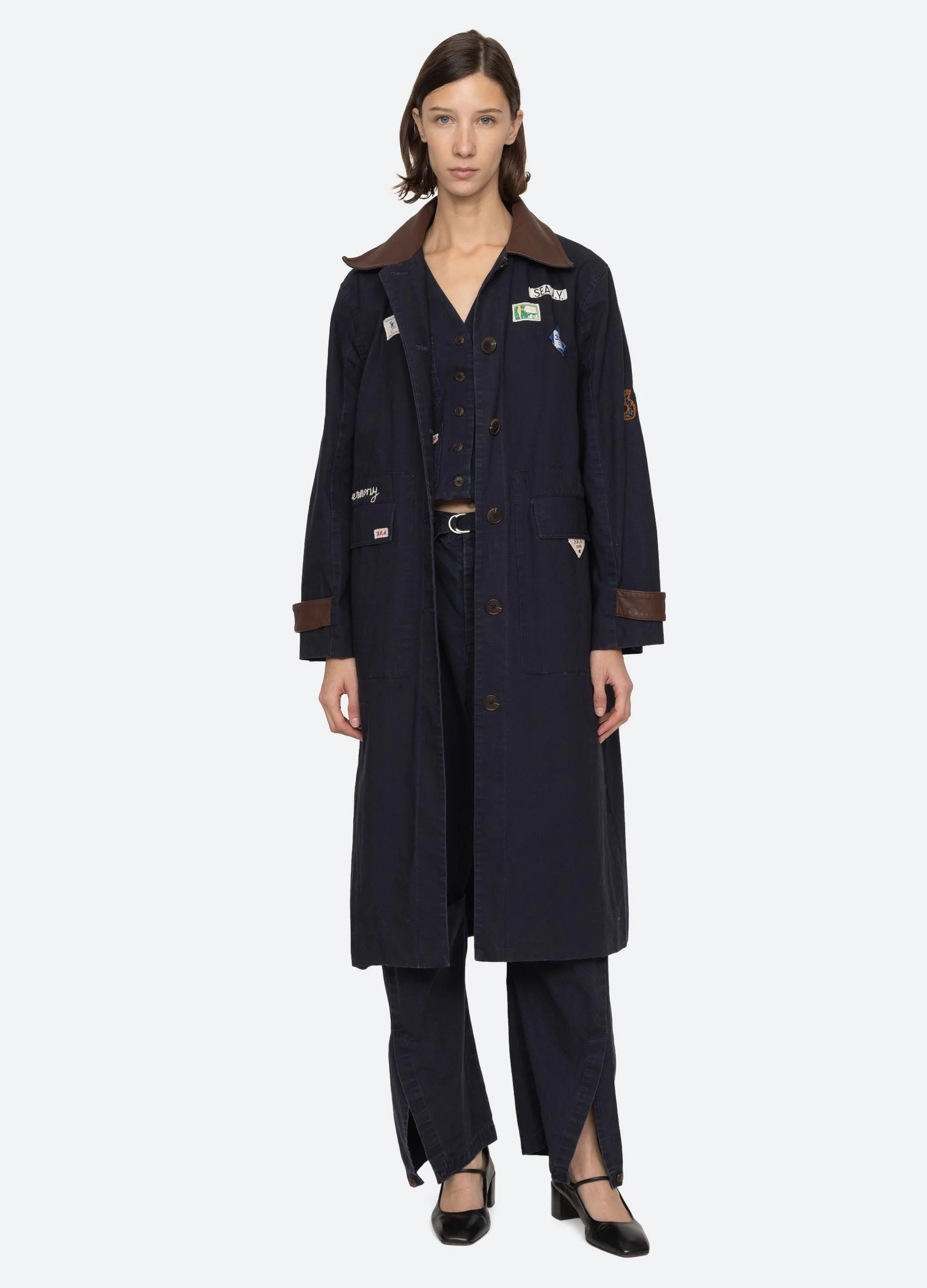 The Carolyn coat is a workwear-inspired piece featuring custom Sea labels and intricate embroidered detailing throughout. This versatile coat blends utilitarian elements with refined craftsmanship. Perfect for layering, it offers an effortlessly chic approach to outerwear. Due to the garment dye process, color variation may occur. No two are exactly alike. DETAILS - self-100% cotton - lining-50% cotton, 50% polyester - button front - designed for a relaxed fit - style #PF25-039 - model is 5'10'' and wearing a size S