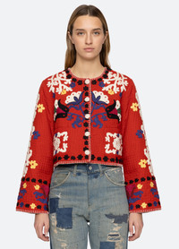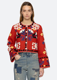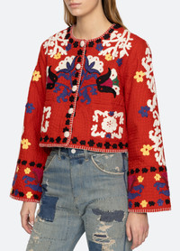 The Catrine embroidered jacket has a cropped silhouette featuring intricate floral embroidery throughout. Designed with a structured silhouette and a button-front closure, this jacket blends classic craftsmanship with contemporary style. Perfect for layering over dresses or pairing with denim. DETAILS - self-100% cotton - lining-100% cotton - polyfill-100% polyester - button front - designed for a relaxed fit - style #PF25-010 - model is 5'10'' and wearing a size S
