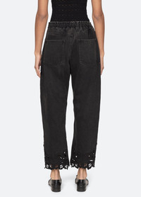The Cavina denim jeans feature embroidered eyelet detailing throughout and elasticized back. DETAILS - self-100% cotton - embroidery-100% polyester - button & zipper closure - elasticized back - designed for a relaxed fit - style #PF25-042 - model is 5'10'' and wearing a size 4