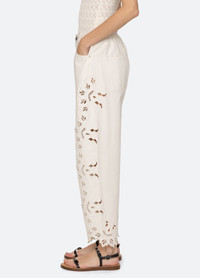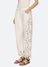 The Cavina denim jeans feature embroidered eyelet detailing throughout and elasticized back. DETAILS - self-100% cotton - embroidery-100% polyester - button & zipper closure - elasticized back - designed for a relaxed fit - style #PF25-042 - model is 5'10'' and wearing a size 4