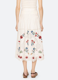 The Celia embroidered skirt features a harmonious blend of elegance and intricate craftsmanship. This midi-length skirt showcases detailed floral embroidery throughout, offering a timeless addition to your wardrobe. DETAILS - self-70% cotton, 30% linen - lining-100% cotton - invisible side zipper - designed for a slimmer fit - style #PF25-048 - model is 5'10'' and wearing a size 4