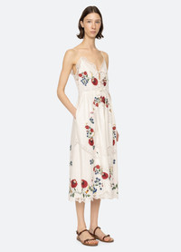 The Celia Slip Dress is a romantic, vintage-inspired piece featuring delicate floral embroidery, lace accents, and front tie closures. Designed with a flattering midi silhouette, it blends effortless elegance with intricate detailing. DETAILS - self-70% cotton, 30% linen - lining-100% cotton - invisible side zipper - designed for a slimmer fit - style #PF25-046 - model is 5'10'' and wearing a size S