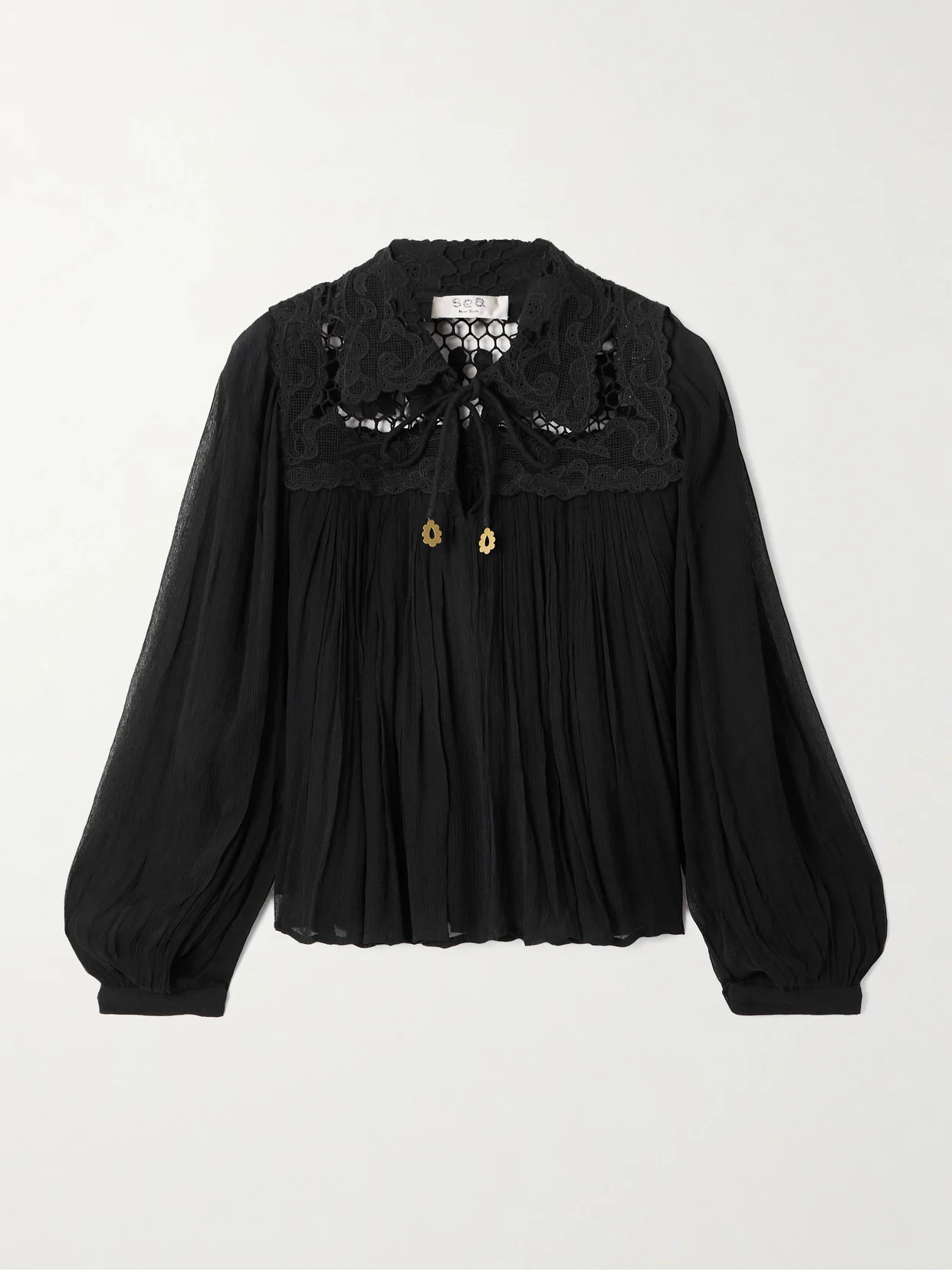 Sea captures a balance of vintage charm and modern design. This 'Daphne' blouse recalls eras gone by with its floaty shape and delicate lace detailing. It's made from pleated, crinkled crepon that moves beautifully and has neck ties tipped with gold-tone embellishments.