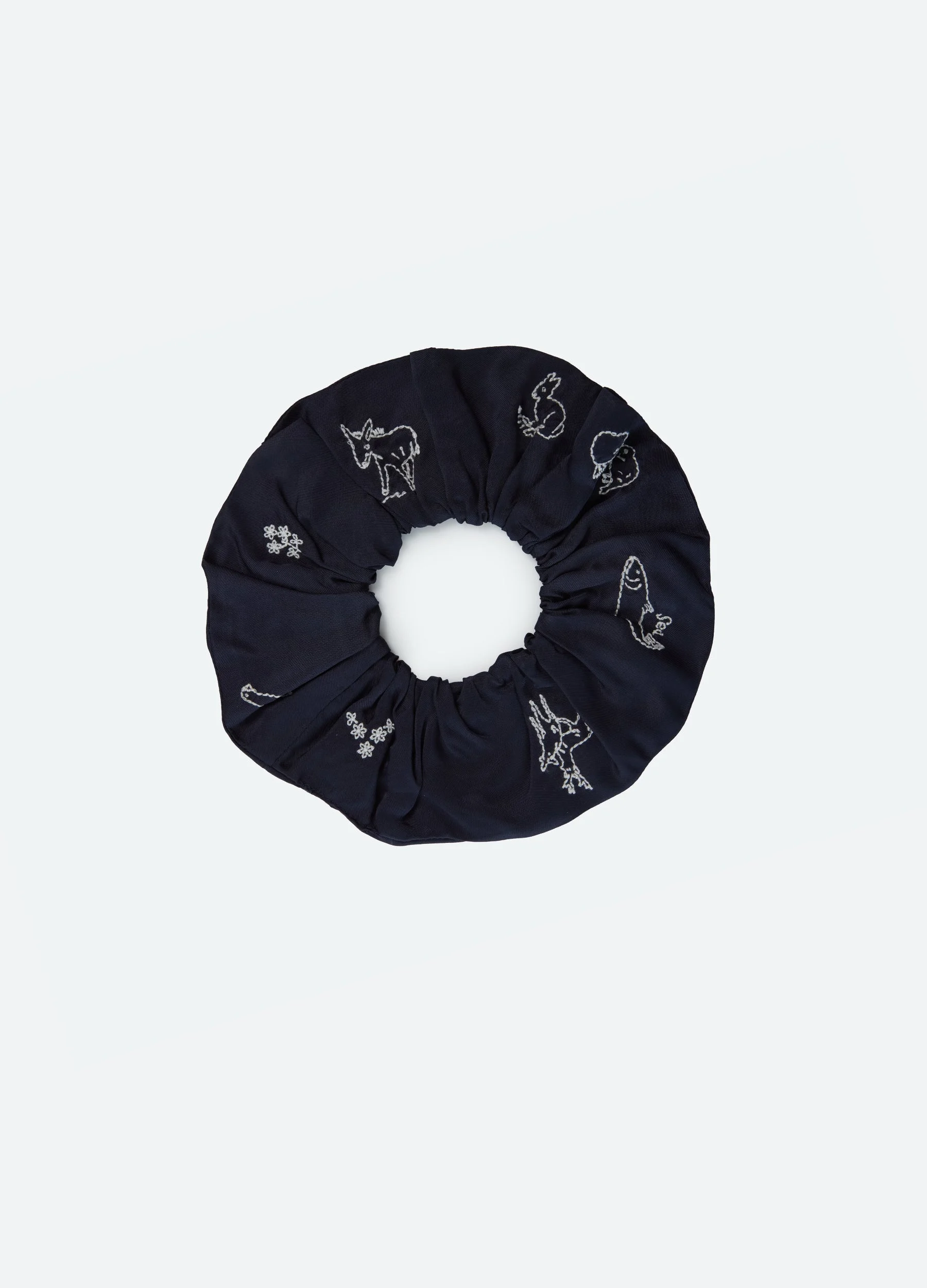 An online and in store exclusive. The Demi embroidered scrunchie is adorned with intricate embroidery throughout, including charming animal motifs that bring a whimsical note. A playful take on an everyday essential. DETAILS - 100% viscose - one size - style #TGHSS26-006