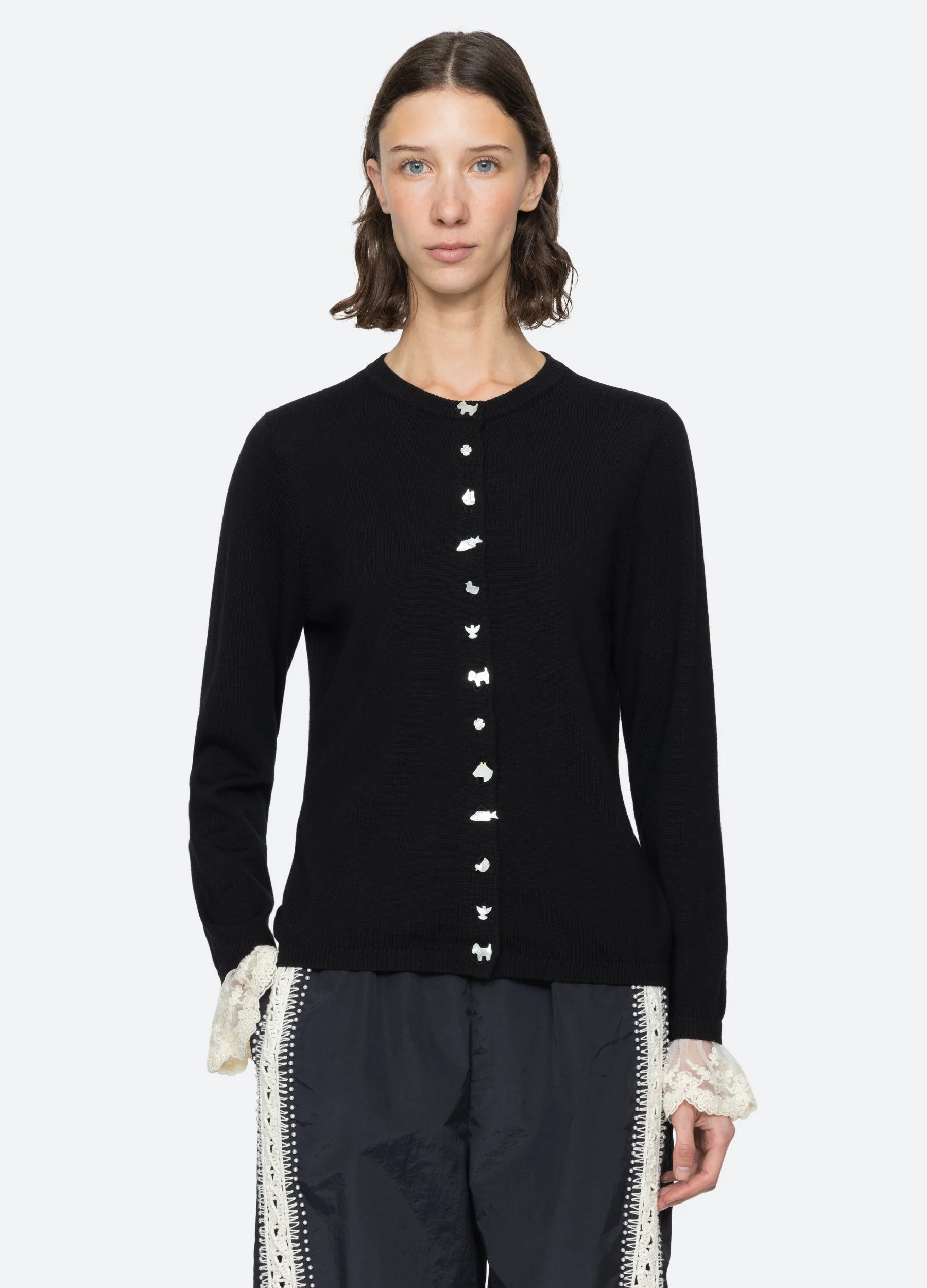 The Diane knit cardigan features intricate folkloric-inspired buttons and detachable lace cuffs, combining artisanal charm with versatile elegance. DETAILS - self-100% wool - decoration-90% polyamide, 10% spandex - embroidery-100% polyester - button front - designed for a slimmer fit - style #RS26-101 - model is 5'10'' and wearing a size S
