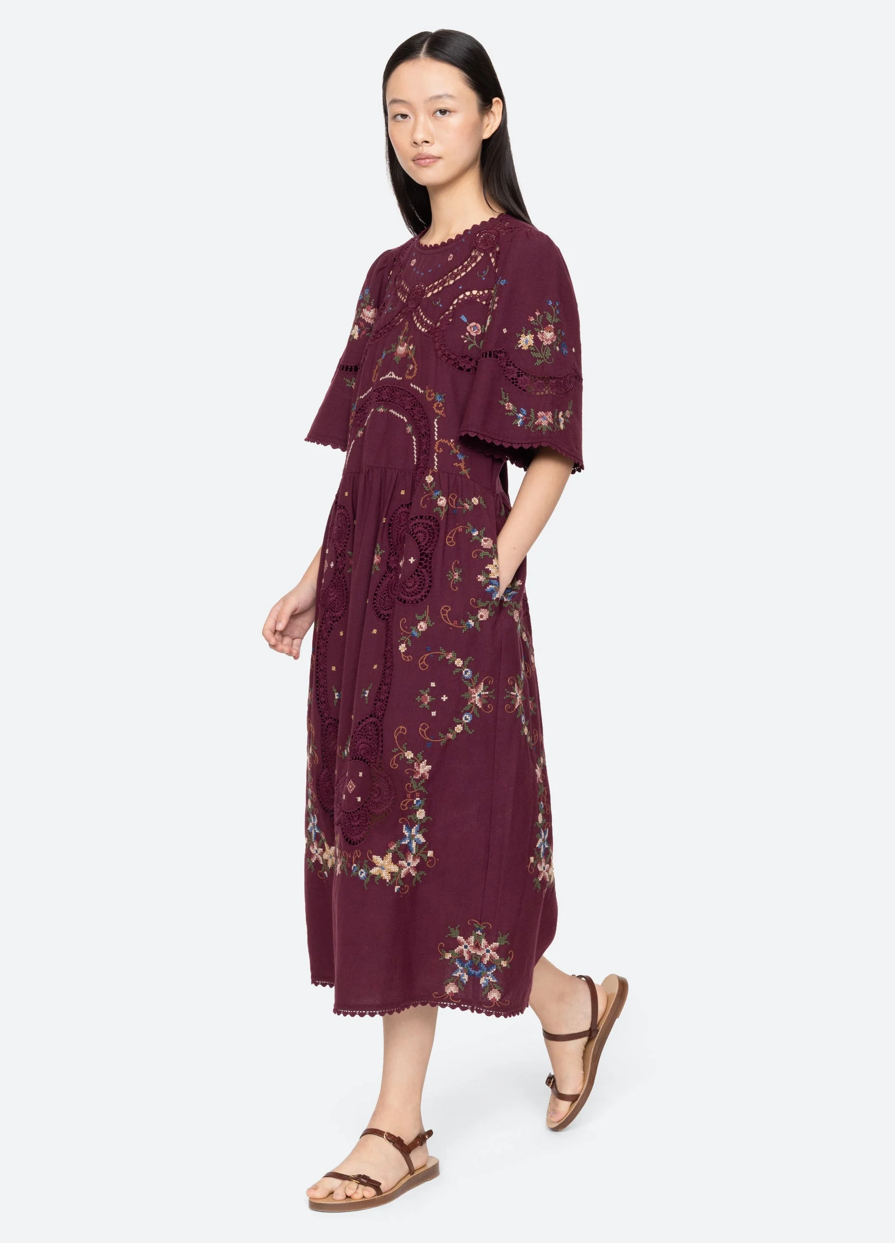 The Edwina short sleeve dress features cross stitch embroidery throughout, short puff sleeves, lace trim detailing and ties at back. DETAILS - self-70% cotton, 30% linen - lining-100% cotton - invisible side zipper - ties at back - designed for a slimmer fit - style #RS25-245 - model is 5'10'' and wearing a size S