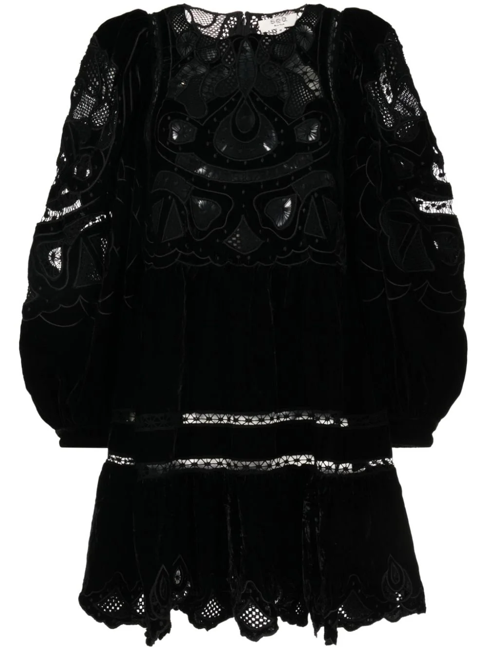 Eliana lace-detail velvet minidress Highlights - Black - Lace embroidery - Velvet - Round neck - Long sleeves - Full lining - Flared hem - Asymmetric hem Imported Composition Polyester 100% SIZE & FIT Model measurements Height 5 ft 10 in(1.77 m) Bust/Chest 31.49 in(80 cm) Hips 35.43 in(90 cm) Waist 25.19 in(64 cm) FittingInformation Designed to be unstructured, offering a loose fit throughout The detachable slip sits just away from the body, offering a close yet comfortable fit Made from a midweight non-stretch fabric This piece fits true to size – take your usual size Washing instructions Dry Clean Only