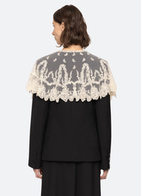 The Elisa capelet jacket is a structured blazer tailored from tropical wool. The removable, delicate floral lace capelet softens the tailored shape, adding a subtle romantic detail. DETAILS - self-51% polyester, 44% wool, 5% spandex - lining-55% viscose, 45% polyester - cape-100% polyester - button front - designed for a relaxed fit - style #RS26-091 - model is 5'10'' and wearing a size S
