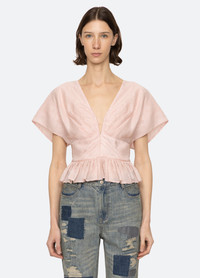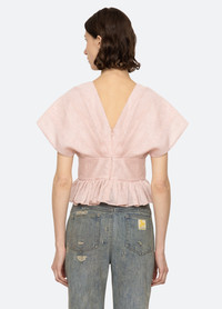 Feminine yet bold, this blush-pink textured top redefines effortless elegance. Featuring a deep V-neckline and sculptural cap sleeves, the fitted bodice cinches at the waist before cascading into a delicate ruffled peplum hem. The perfect blend of soft structure and playful movement, this piece pairs seamlessly with denim for a modern contrast or with tailored pieces for a polished statement. DETAILS - self-58% polyester, 42% polyamide - lining-100% cotton - invisible back zipper - designed for a slimmer fit - style #PF25-052 - model is 5'10'' and wearing a size 4