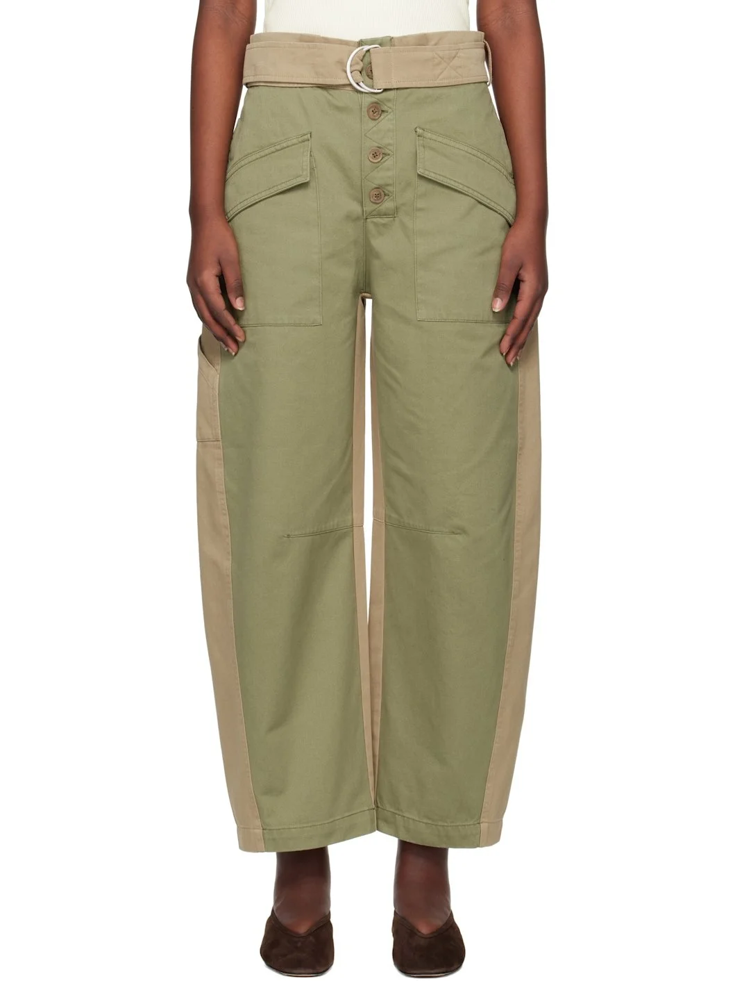 Tapered cotton twill trousers. · Paneled construction · Belt loops and integrated cinch belt · Three-pocket styling · Exposed button fly · Dart at knees · Twisted outseams · Patch pocket at outseam Supplier color: Chino 100% cotton. Made in Turkey 251271F087000