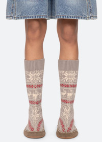 Part of the apres ski capsule, the Hollis fair isle knit slippers are designed with extended coverage for warmth and comfort. Blending the comfort of a favorite knit sock with the ease of a slipper. DETAILS - 100% wool, suede outsole - slip on - style #AS25-017