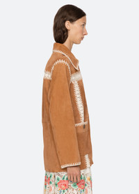 The Irena suede jacket is defined by hand-crocheted detailing, refined contrast stitching, and oversized front pockets. It brings an elevated artisinal sensibility to everyday layering. DETAILS - self-100% lamb leather - lace-70% cotton, 30% polyester - lining-100% acetate twill - button front - designed for a relaxed fit - style #SS26-032 - model is 5'10'' and wearing a size S