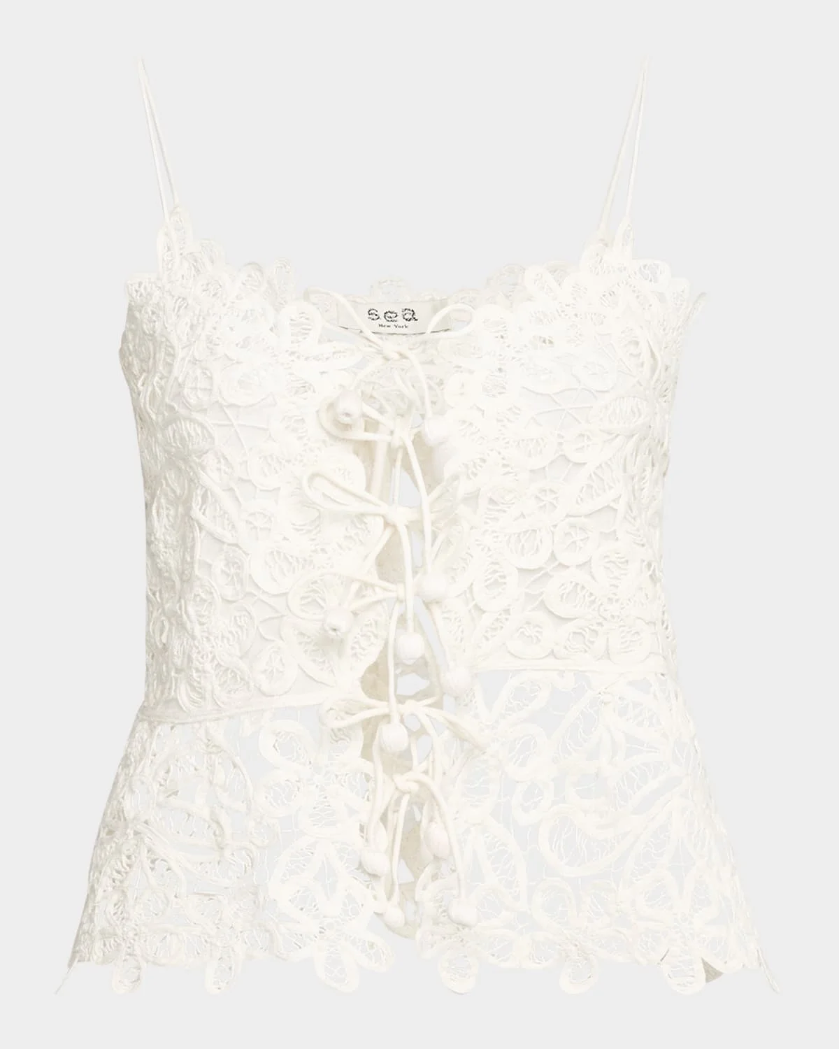 - Sea "Iyla" intricate soutache embroidered top finished with a tie-front - V neckline - Spaghetti straps - Slim fit - Peplum hem - Button-front - Cotton/linen/polyester - Imported