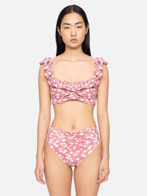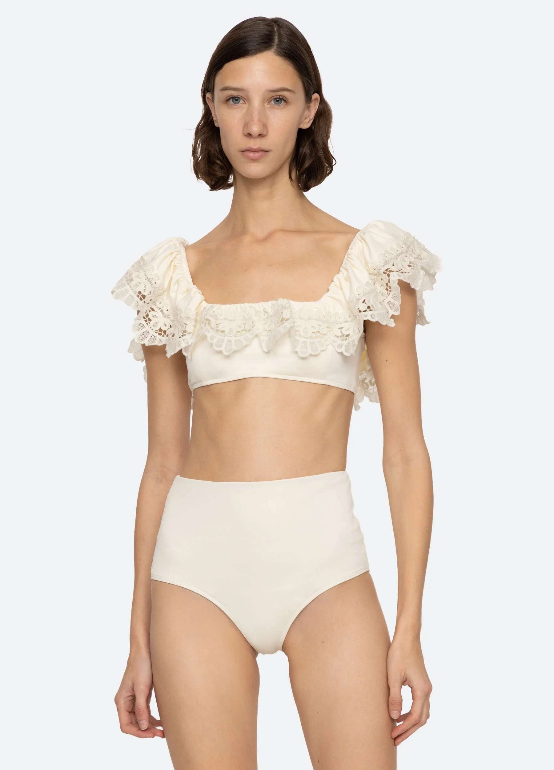 The Iyla embroidered bikini top features delicate soutache embroidery and ruffle trim. DETAILS - self-82% nylon, 18% spandex - decoration-100% cotton - slip on - designed for a slimmer fit - style #PF25-705 - model is 5'10'' and wearing a size S