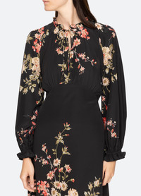 The Jolie floral print dress features a flattering midi silhouette with long puff sleeves and a delicate neck tie adorned with tassel charms. A soft ruffle hem adds a playful touch, enhancing its romantic and feminine appeal. DETAILS - self-65% viscose, 35% silk - lining-100% viscose - invisible back zipper - designed for a slimmer fit - style #AW25-048 - model is 5'10'' and wearing a size 4