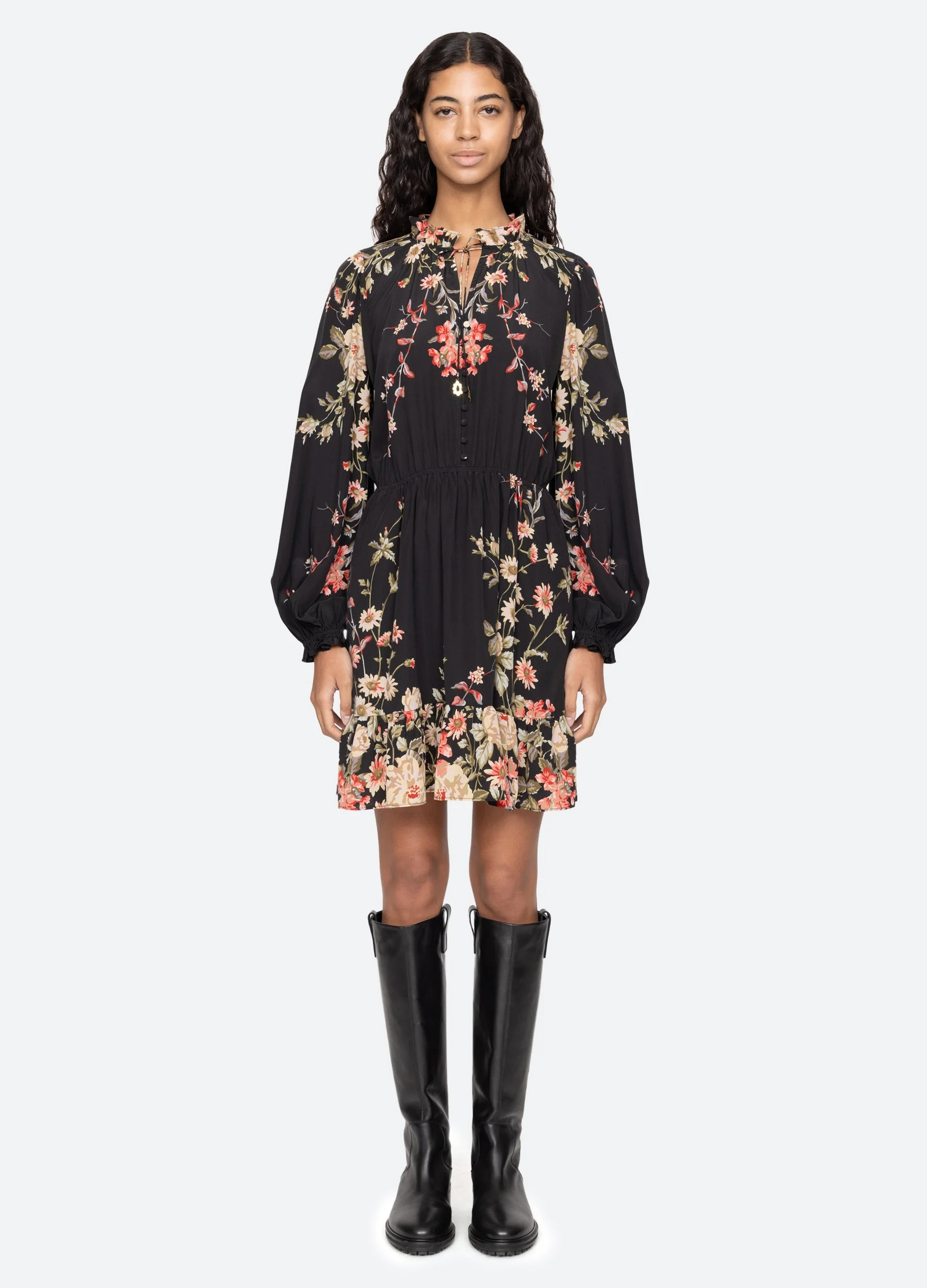 The Jolie floral print mini dress features a softly structured silhouette with delicate button detailing, a front tie accented by tassel charms, and voluminous puff sleeves that lend a vintage-inspired elegance. DETAILS - self-65% viscose, 35% silk - lining-100% viscose - button front - style #AW25-047 - model is 5'10'' and wearing a size S