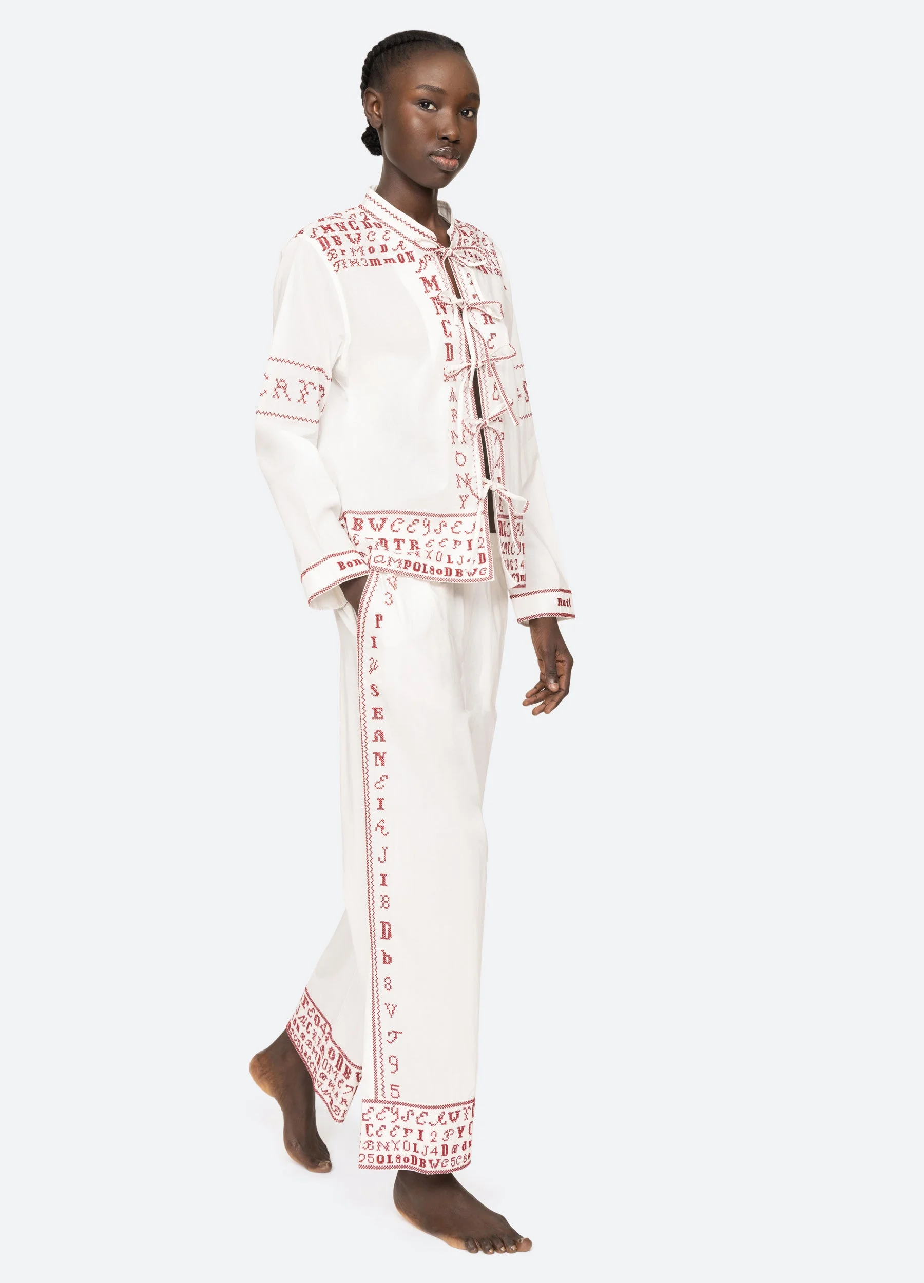 The Kit embroidered pajama set draws inspiration from vintage embroidery with sampler-style motifs, exuding heritage charm with a contemporary twist. Front tie closures and contrasting embroidery add a playful touch to this sleepwear set. DETAILS - self-100% cotton - embroidery-100% polyester - tie front - elasticized waist - designed for a relaxed fit - style #RS26-801 - model is 5'10'' and wearing a size S