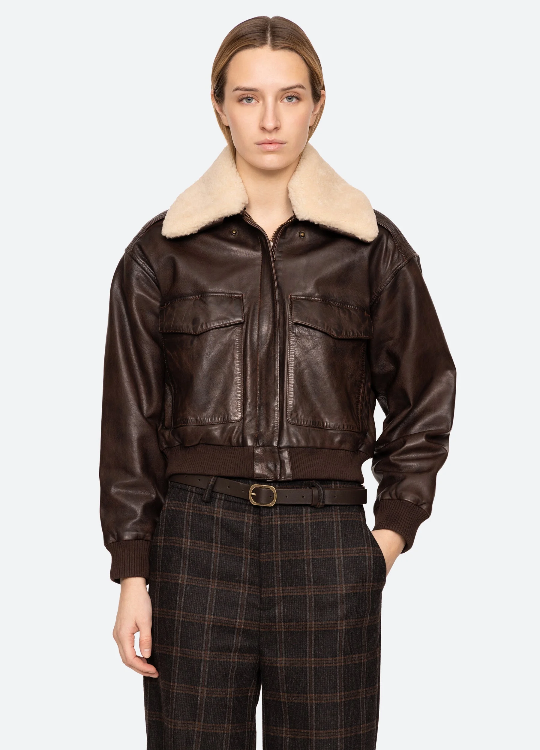 The Lenoir leather bomber jacket features a chic, cropped silhouette complemented by ribbed knit hem and cuffs. Finished with a removable shearling collar, it seamlessly combines style and versatility for a contemporary, luxurious look. DETAILS - self-100% lamb leather - lining-100% viscose - zipper front - designed for a relaxed fit - style #AW25-086 - model is 5'10'' and wearing a size S