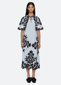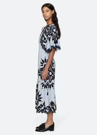 The Liliana applique short sleeve dress features delicate applique detailing and tassel neck ties, adding a unique touch to its classic silhouette. The cape sleeves and midi length offer a contemporary flair. DETAILS - self-100% viscose - applique-100% viscose - invisible side zipper - designed for a slimmer fit - style #PF25-068 - model is 5'10'' and wearing a size 4