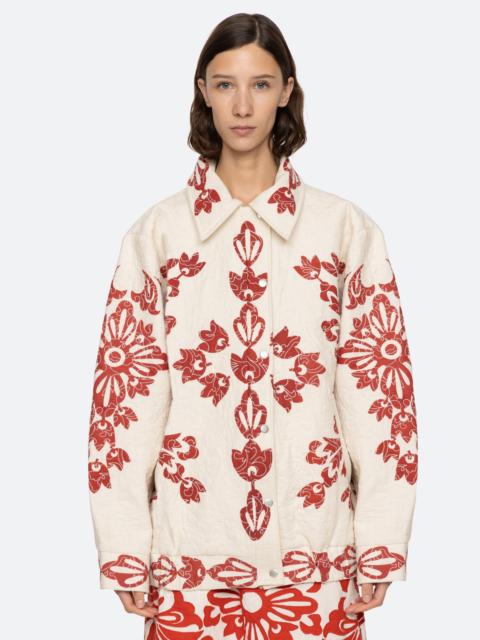 The Liliana quilted jacket features exquisite quilted detailing, adding depth and texture to its classic silhouette. Crafted with meticulous attention to detail, it offers both comfort and style. Designed for an oversized, relaxed fit. DETAILS - self-88% cotton, 12% linen - polyfill-100% polyester - lining-100% cotton - zipper & snap front closure - style #PF25-070 - model is 5'10'' and wearing a size S